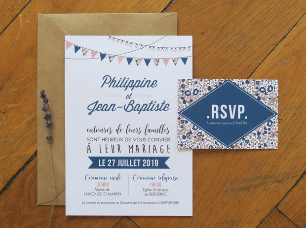 Un faire-part de mariage champêtre guinguette pour un esprit festif. Place aux fanions et au tissu liberty.